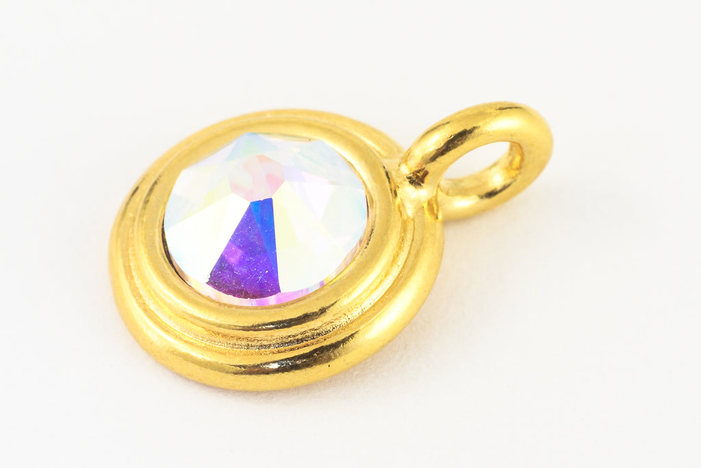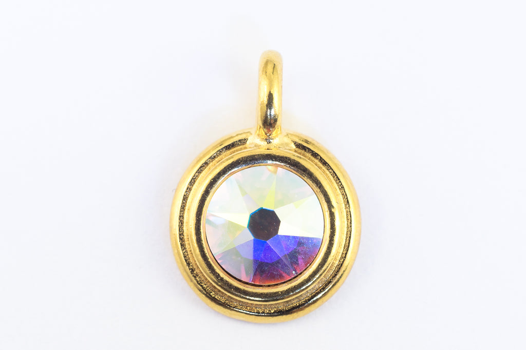16.6mm x 11.6mm bright gold round charm with stepped bezel filled by 34ss flat back crystal AB rhinestone.