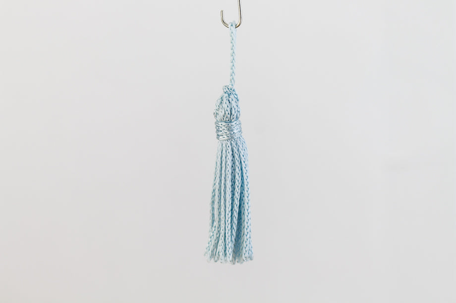 1.5 inch (38mm) long tassel made of silver blue nylon cord.