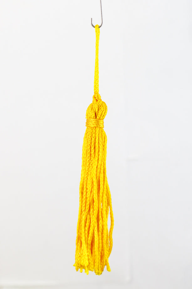 3 inch long tassel made of sunflower yellow nylon cord. Handmade in China circa 1990's.