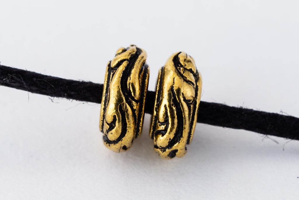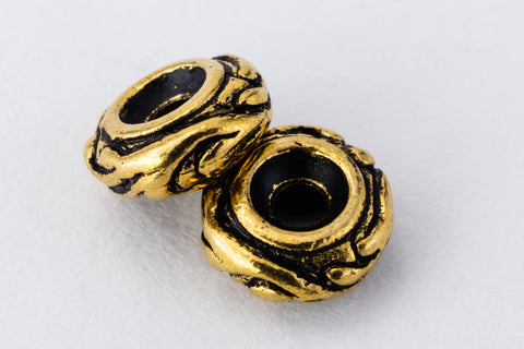 6mm x 2.5mm antique gold "Woodland" style bead with raised floral motif and 1.5mm hole.