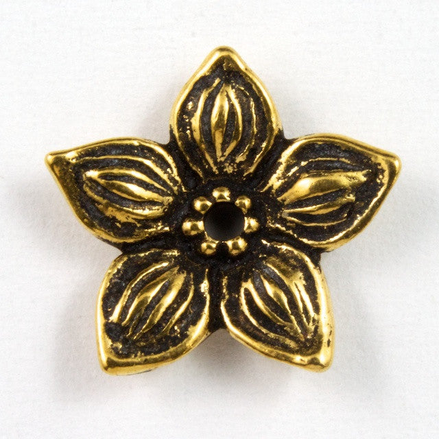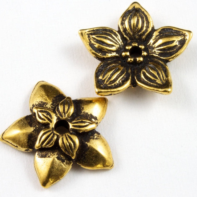 11mm antique gold star jasmine bead cap with 1mm hole. Detail both sides.