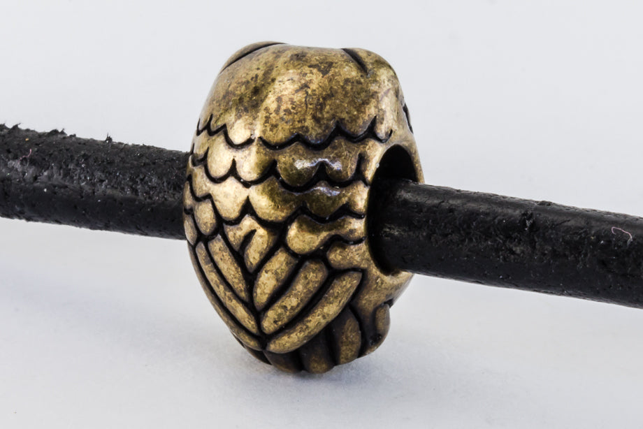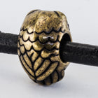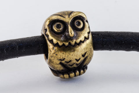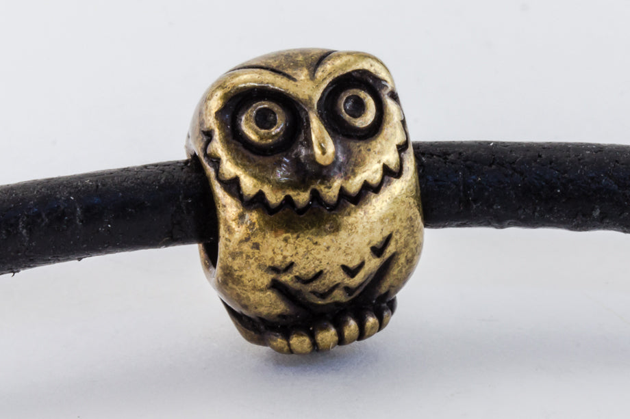12mm x 8mm antique brass owl bead with sideways hole. Fits 4mm cord.
