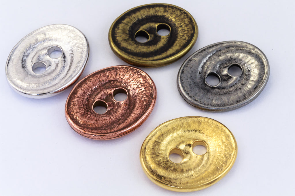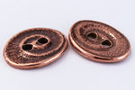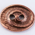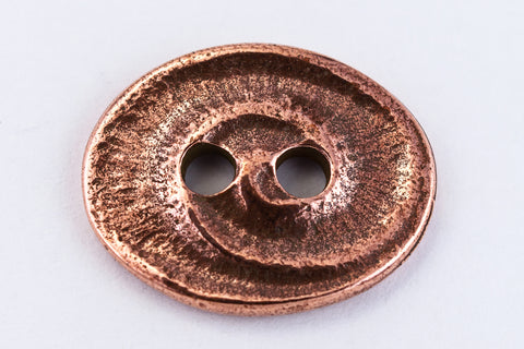 17.5mm x 14mm antique copper oval pewter button with raised swirl and two 2.25mm holes.