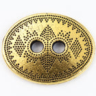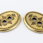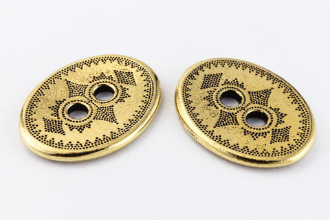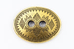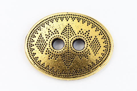 19mm x 14.75mm antique gold oval pewter button with geometric dot pattern and two 2.25mm holes.