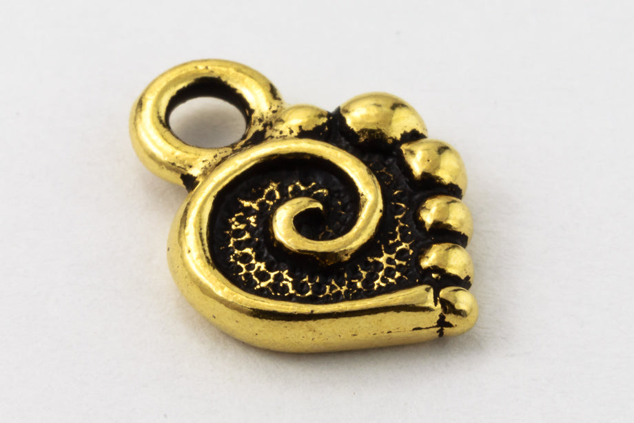 9.75mm x 12.75mm antique gold heart with spiral detail and 1.5mm loop at top.