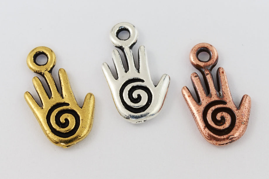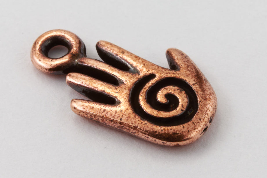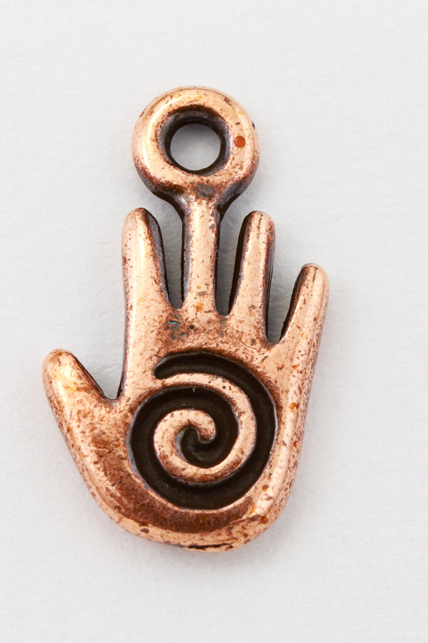 8mm x 14.5mm antique copper hand with etched spiral and 1.25mm loop at top. Detail both sides.