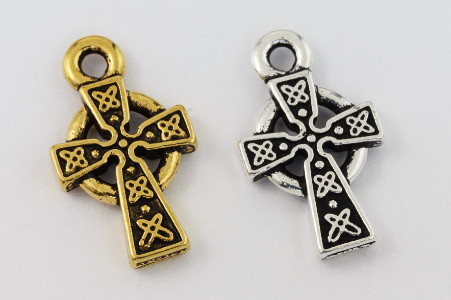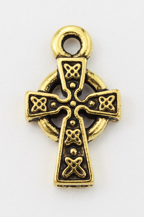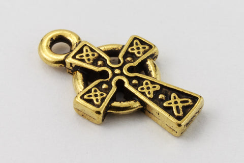 8.75mm x 15mm antique gold Celtic style cross with knotwork detail and 1.25mm loop at top. Detail both sides.