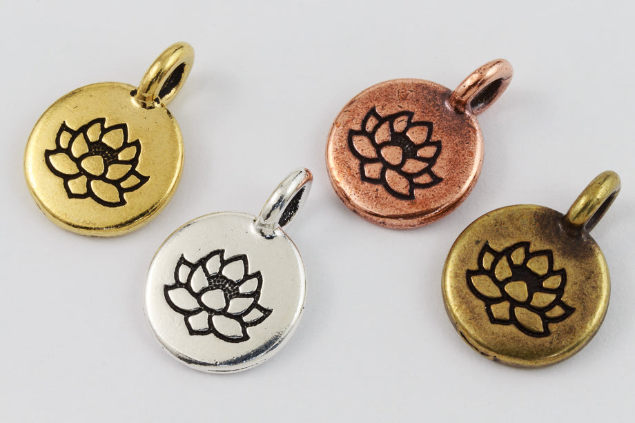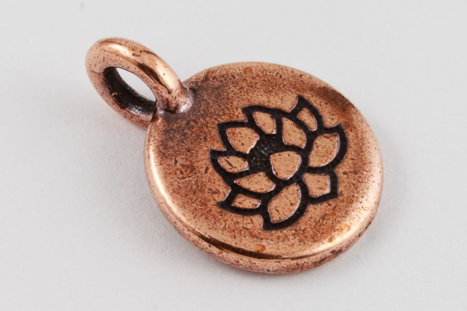 11.6mm x 16.6mm antique copper round charm with etched lotus and 2.6mm loop at top. Loop is perpendicular to surface of charm.