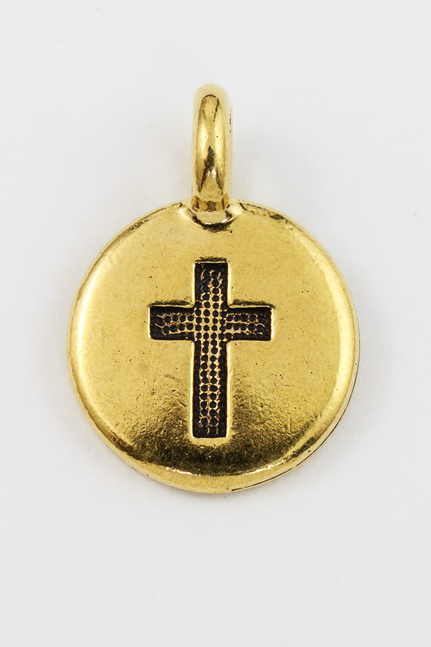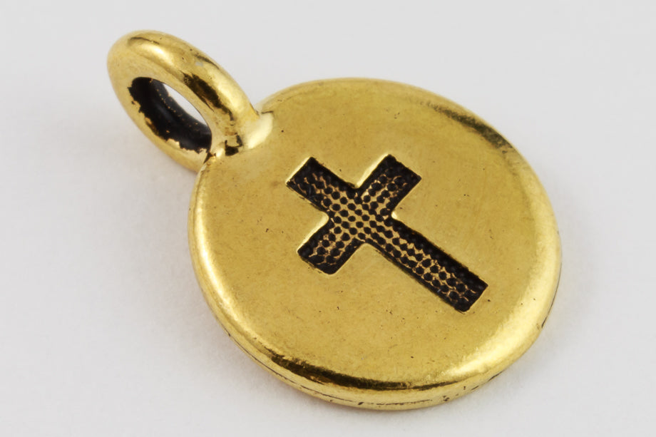 11.6mm x 16.6mm antique gold round charm with engraved cross and 2.6mm loop at top. Loop is perpendicular to surface of charm.