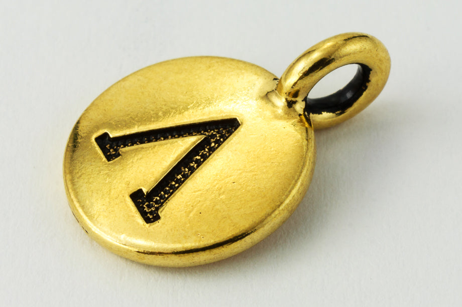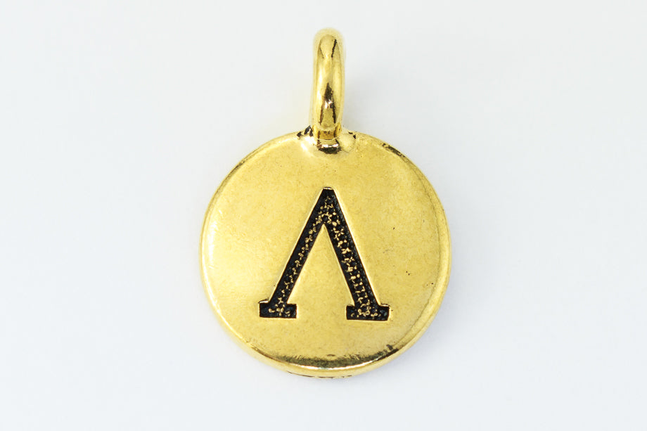 16.6mm x 11.6mm antique gold charm with inscribed capital Greek letter "Lamda". 2.6mm loop at top.