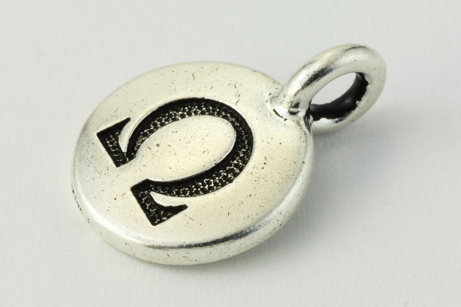 16.6mm x 11.6mm antique silver charm with inscribed capital Greek letter "Omega". 2.6mm loop at top.