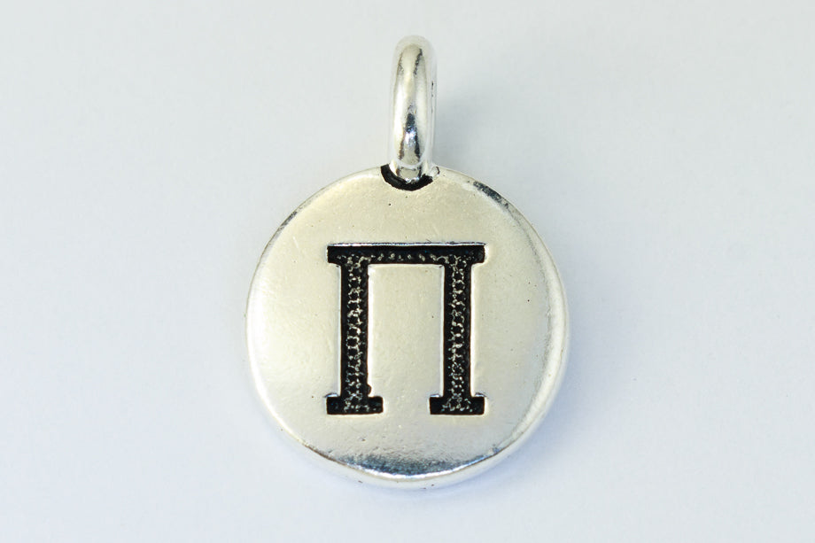 16.6mm x 11.6mm antique silver charm with inscribed capital Greek letter "Pi". 2.6mm loop at top.