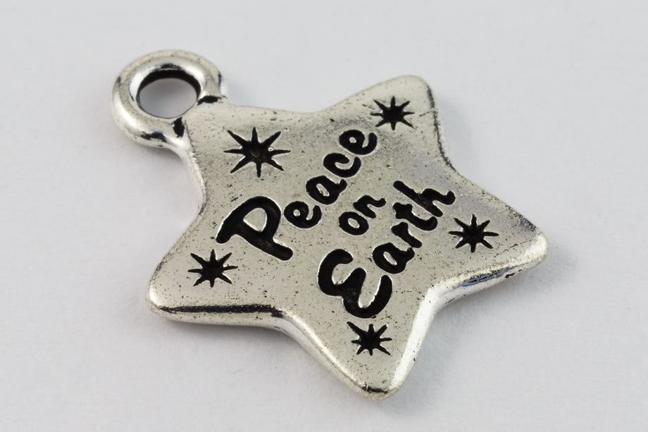 15mm x 18.7mm antique silver star inscribed with "Peace on Earth" and little stars.