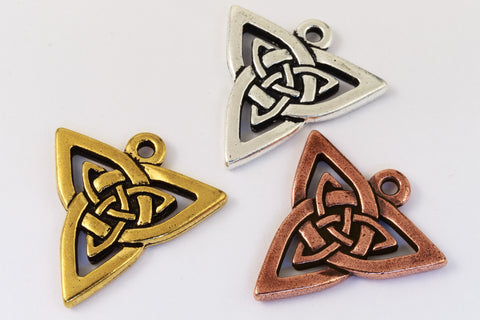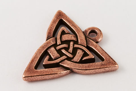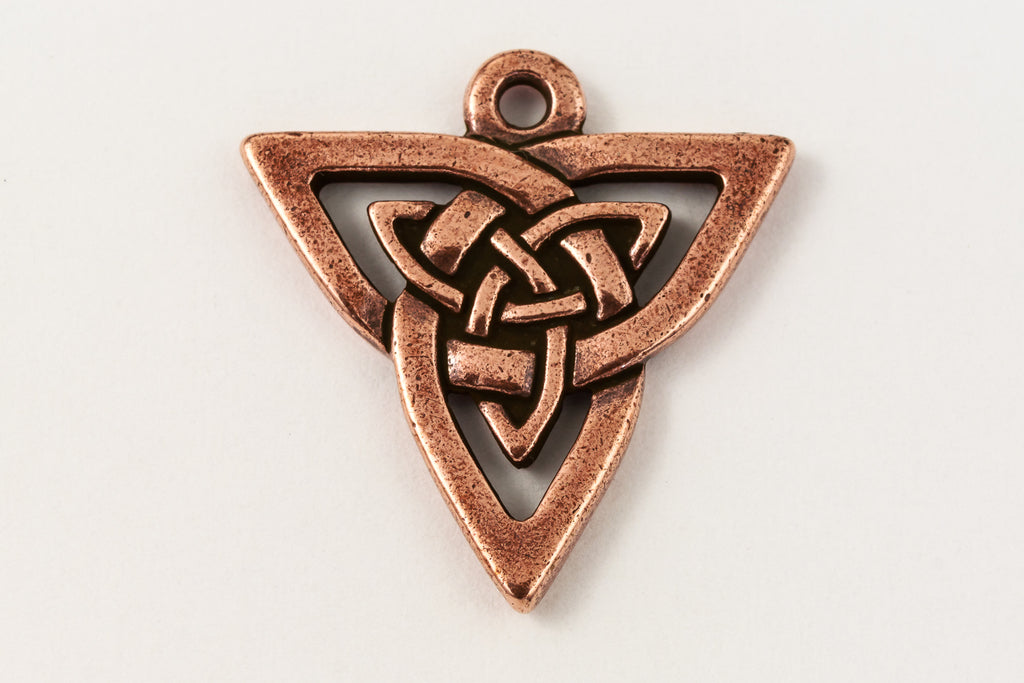 21mm x 20.25mm antique copper pendant in the shape of an open three point Celtic "triquetra" knot.
