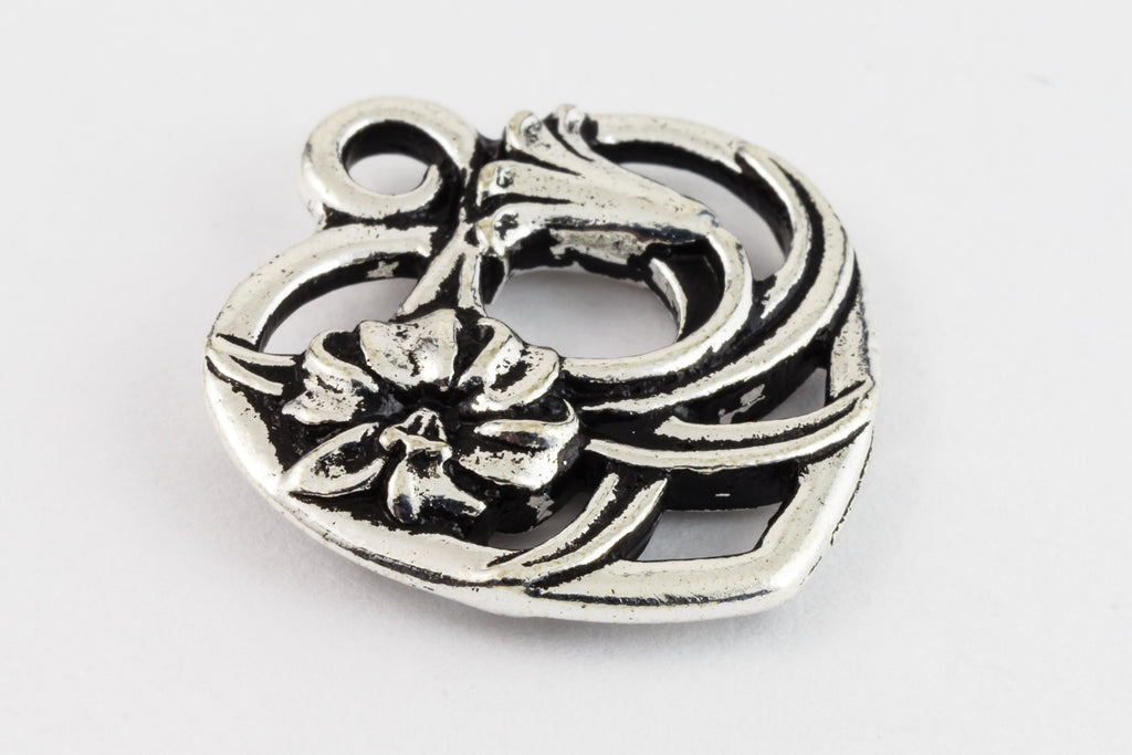 18.2mm x 19.6mm antique silver open heart with detailed lilies and 2mm loop at top.