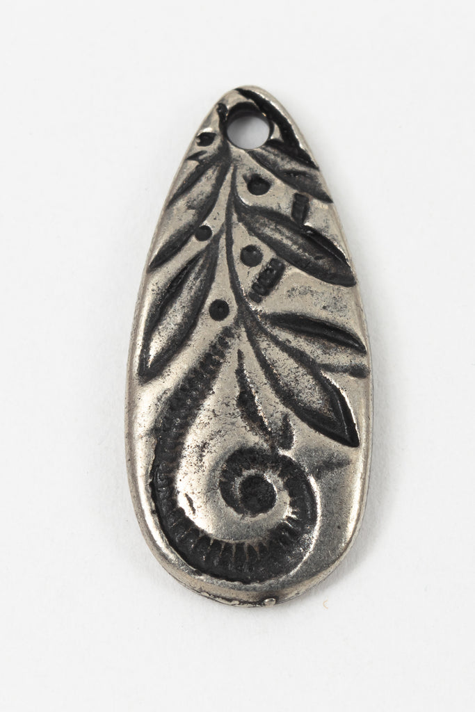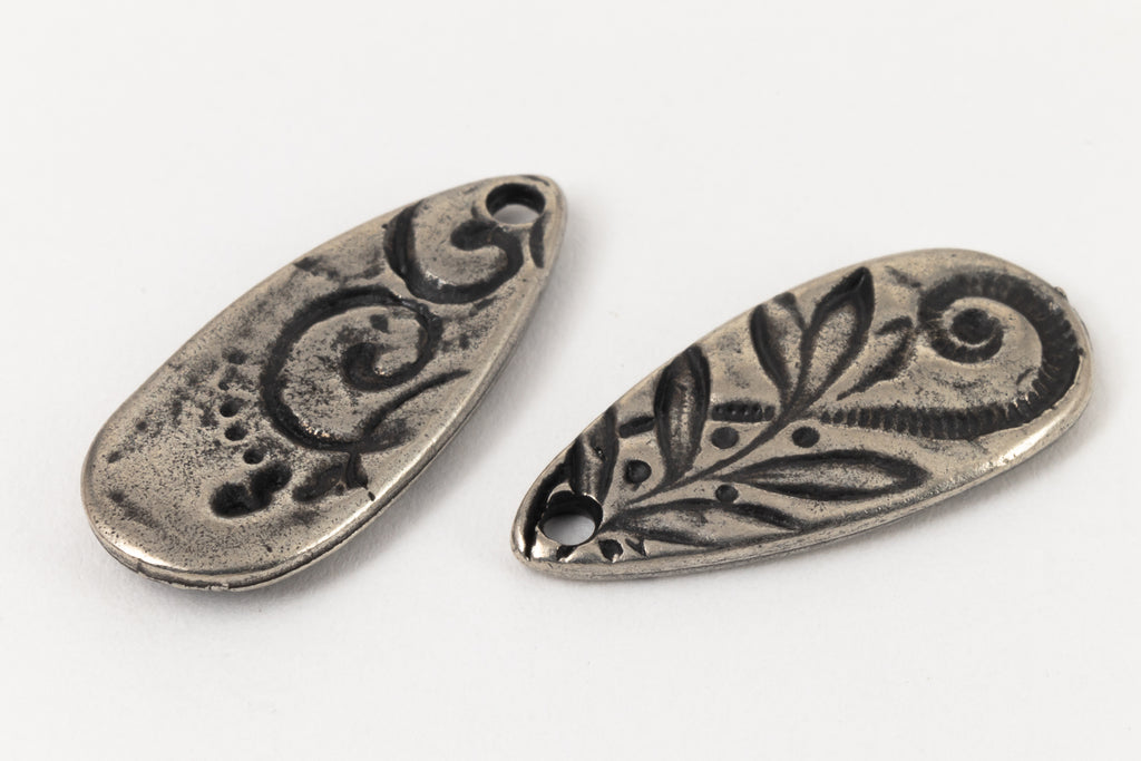 10.1mm x 22.5mm teardrop with "Jardin" style embossed floral detail and 1.6mm hole in narrow end.