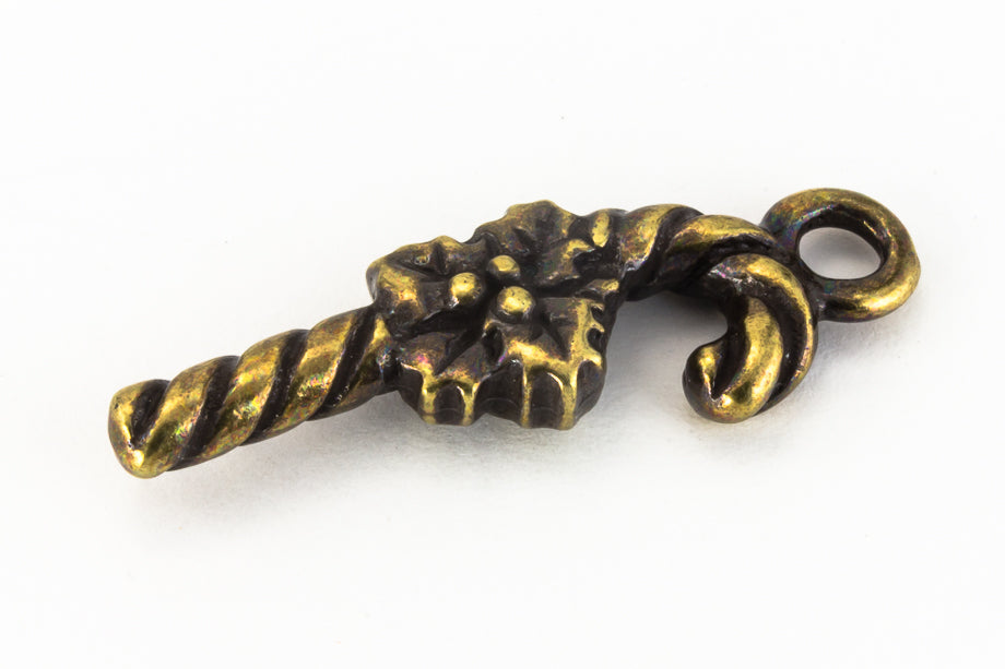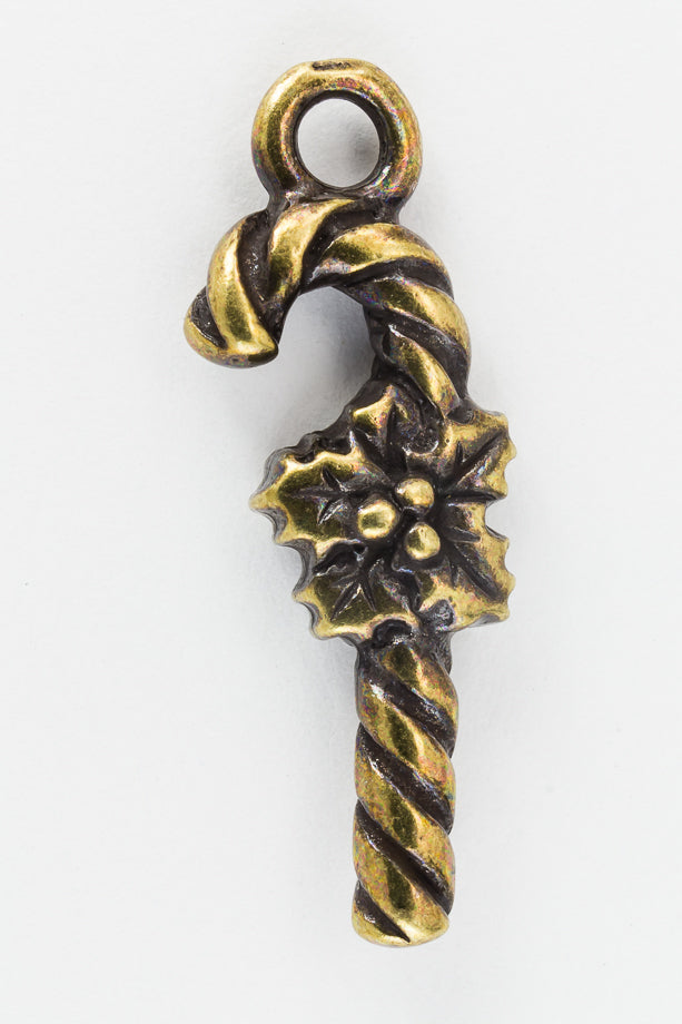 25.25mm x 9.25mm antique brass detailed candy cane with holly spray and loop at top. Inner diameter of loop measures 2.25mm.