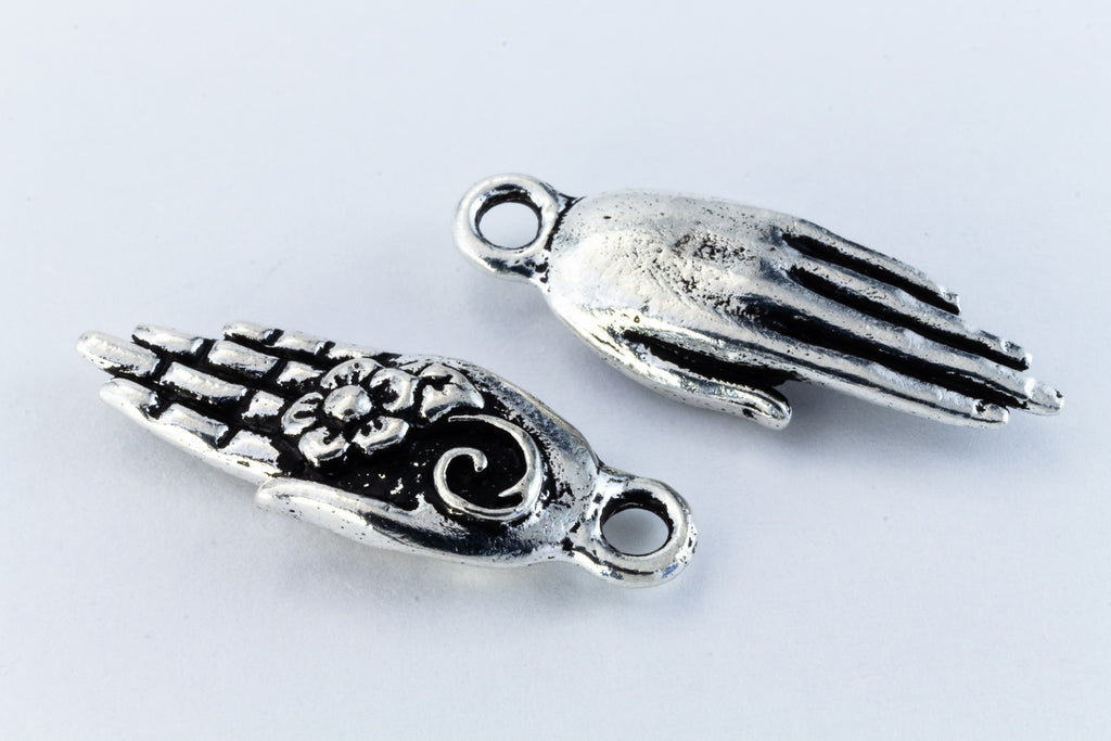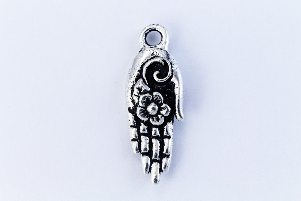 9.6mm x 26.75mm antique silver dimensional hand holding a blossom.