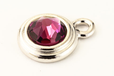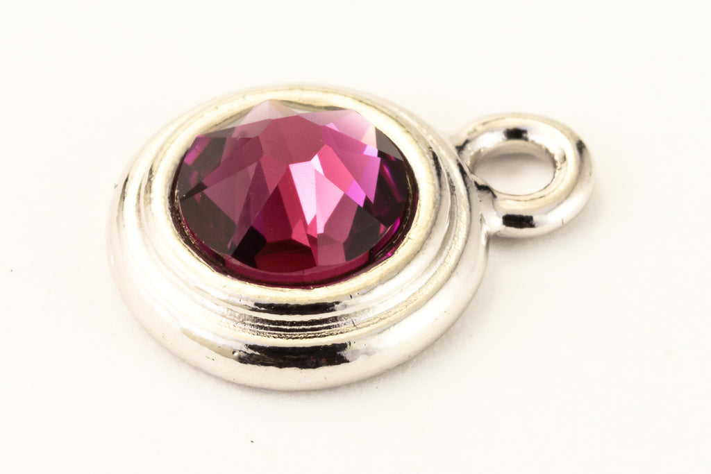 16.6mm x 11.6mm rhodium round drop with stepped bezel filled by 34ss flat back amethyst rhinestone.
