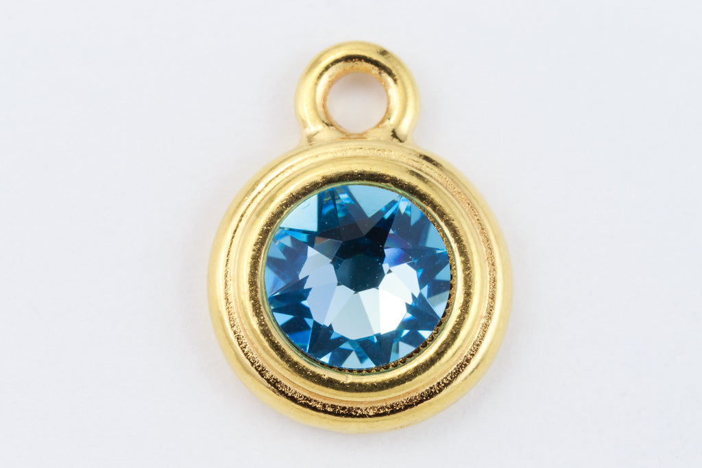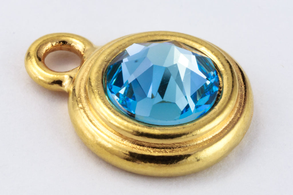 16.6mm x 11.6mm bright gold round drop with stepped bezel filled by 34ss flat back aquamarine rhinestone.