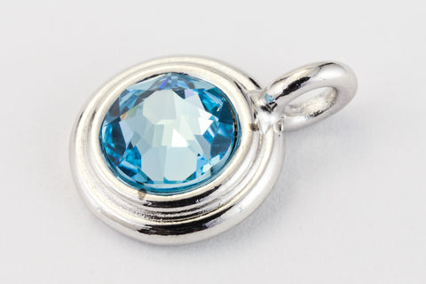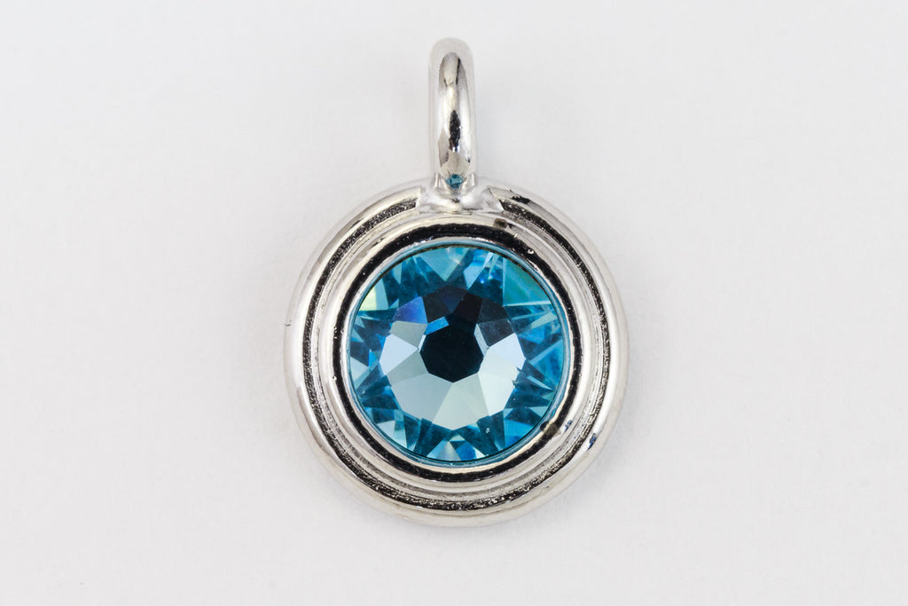 16.6mm x 11.6mm rhodium round charm with stepped bezel filled by 34ss flat back aquamarine rhinestone.