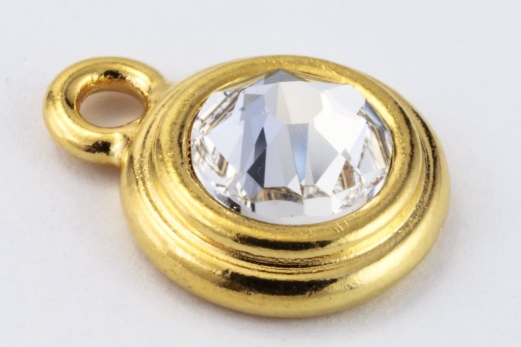 16.6mm x 11.6mm bright gold round drop with stepped bezel filled by 34ss flat back crystal rhinestone.
