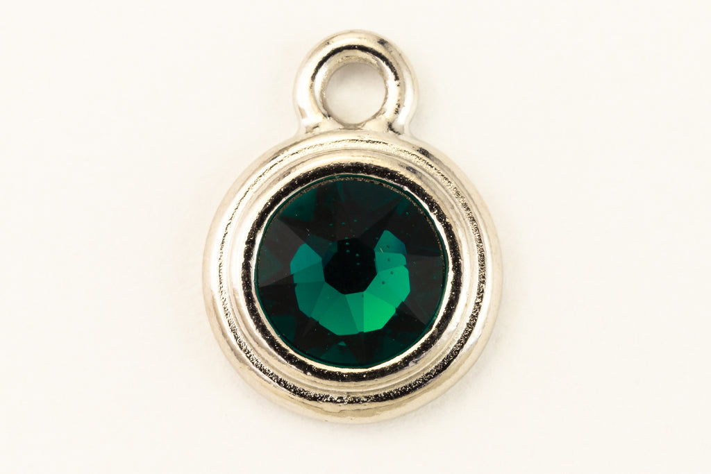 16.6mm x 11.6mm rhodium round drop with stepped bezel filled by 34ss flat back emerald rhinestone.