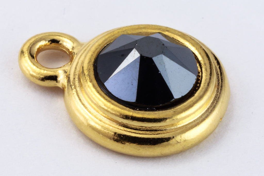 16.6mm x 11.6mm bright gold round drop with stepped bezel filled by 34ss flat back jet hematite rhinestone.