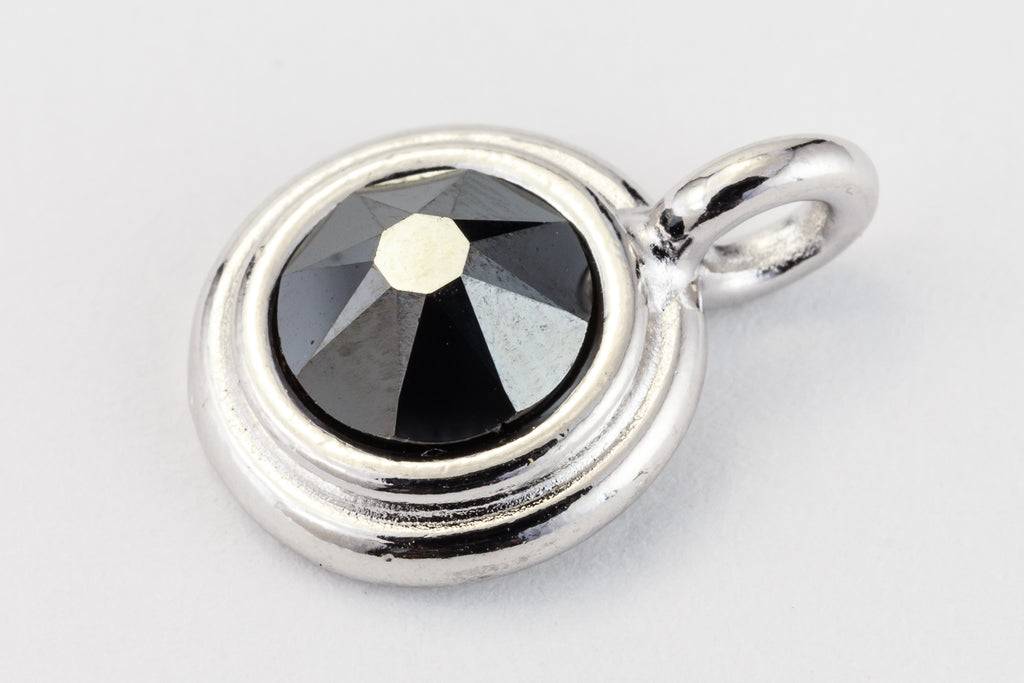 16.6mm x 11.6mm rhodium round charm with stepped bezel filled by 34ss flat back jet hematite rhinestone.