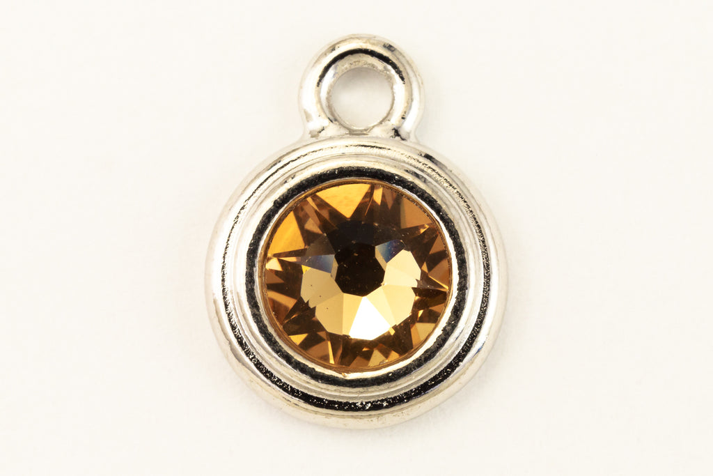 16.6mm x 11.6mm rhodium round drop with stepped bezel filled by 34ss flat back light Colorado topaz rhinestone.
