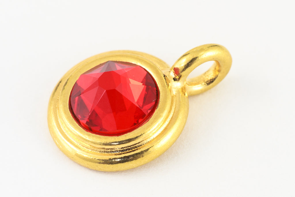 16.6mm x 11.6mm bright gold round charm with stepped bezel filled by 34ss flat back light Siam rhinestone.