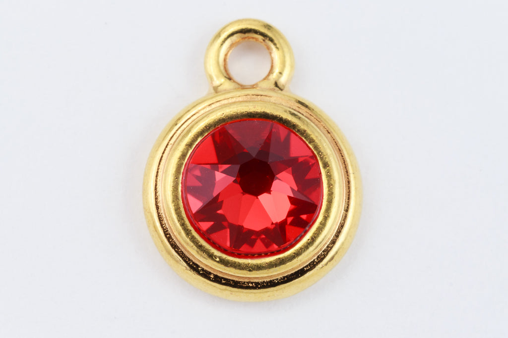 16.6mm x 11.6mm bright gold round drop with stepped bezel filled by 34ss flat back light Siam rhinestone.