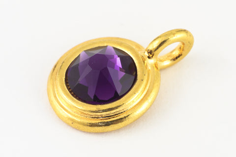 16.6mm x 11.6mm bright gold round charm with stepped bezel filled by 34ss flat back purple velvet rhinestone.