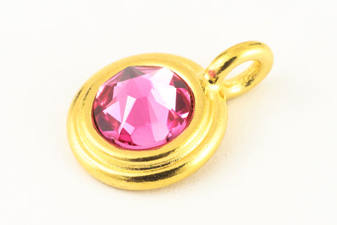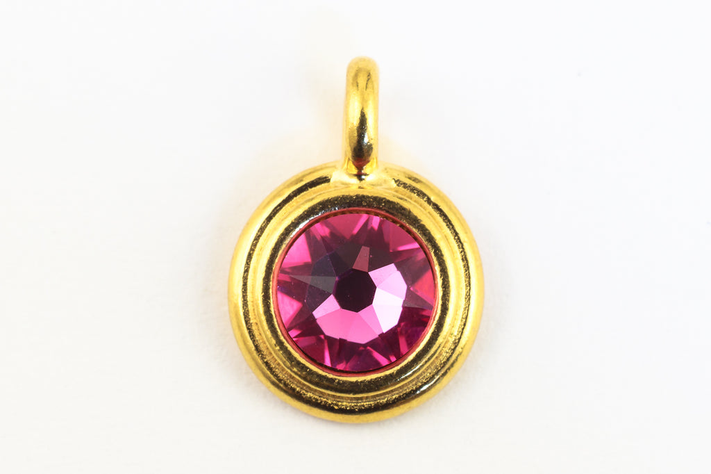 16.6mm x 11.6mm bright gold round charm with stepped bezel filled by 34ss flat back rose rhinestone.