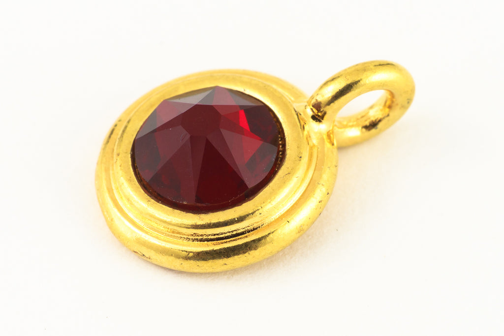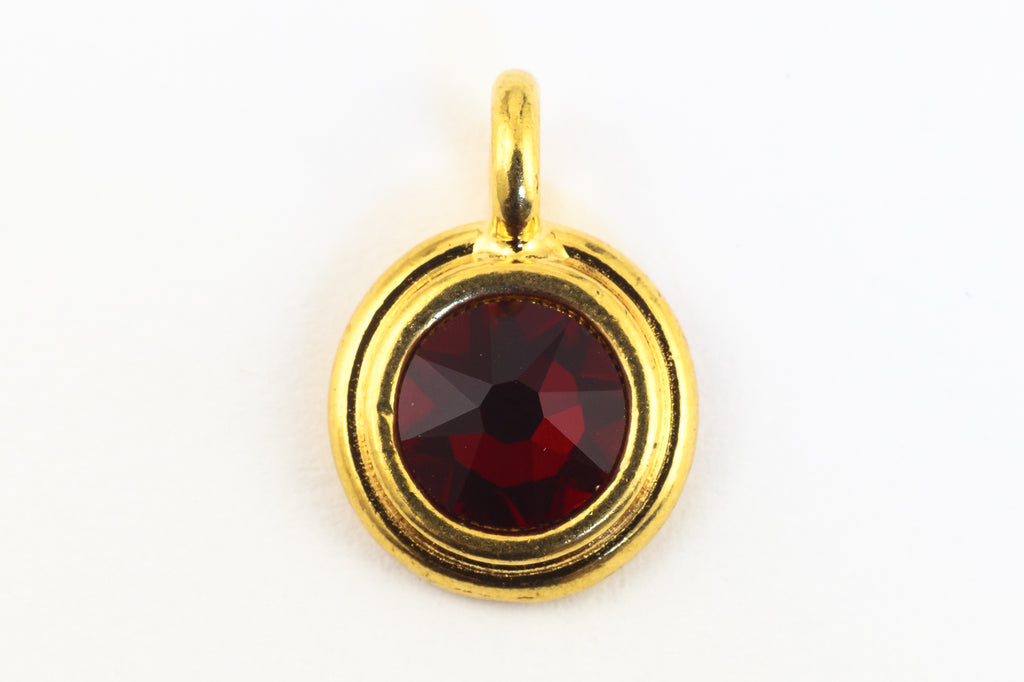 16.6mm x 11.6mm bright gold round charm with stepped bezel filled by 34ss flat back Siam rhinestone.