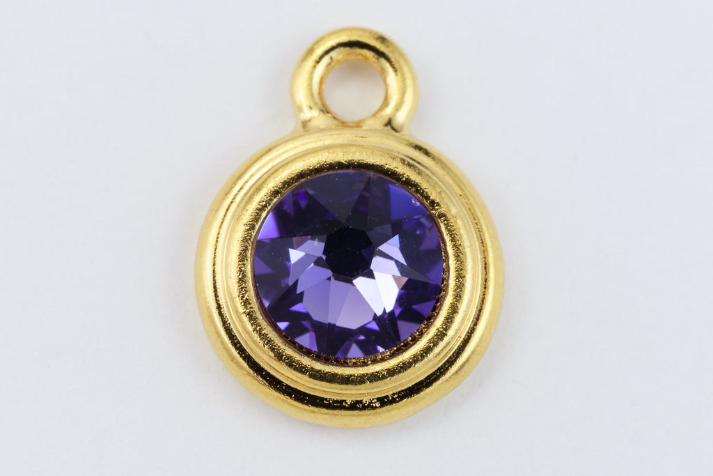 16.6mm x 11.6mm bright gold round drop with stepped bezel filled by 34ss flat back tanzanite rhinestone.