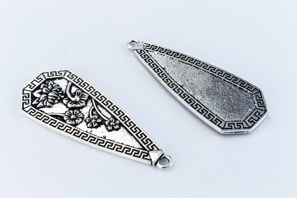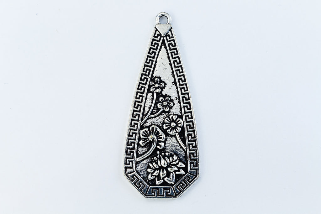 23mm x 58mm antique silver angled teardrop pendant with detailed flowers and Greek key border.