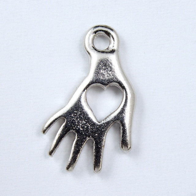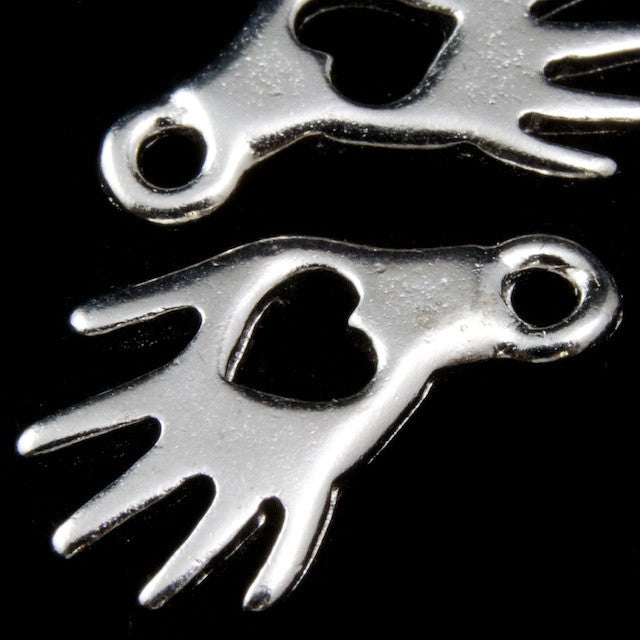 9mm x 15mm silver tone rhodium plated hand with open heart in palm.
