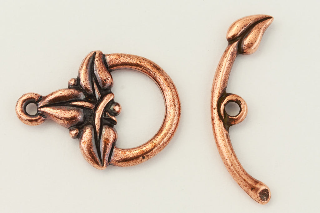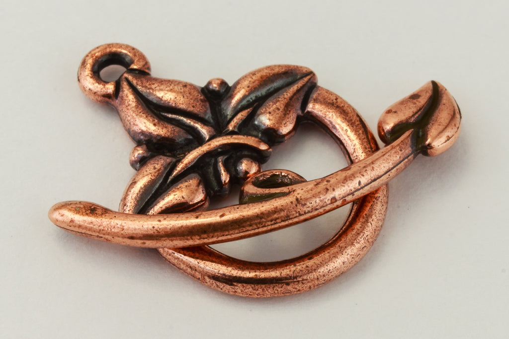 Antique copper toggle clasp set with spray of three leaves.