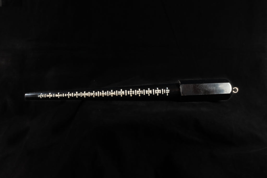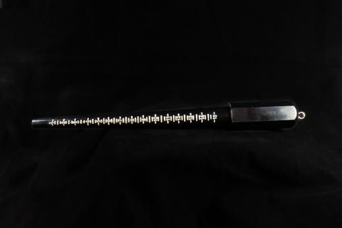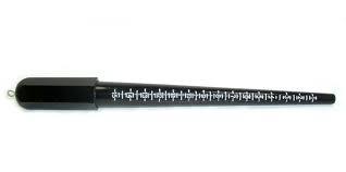 Black plastic mandrel with white indented lines for ring sizing.