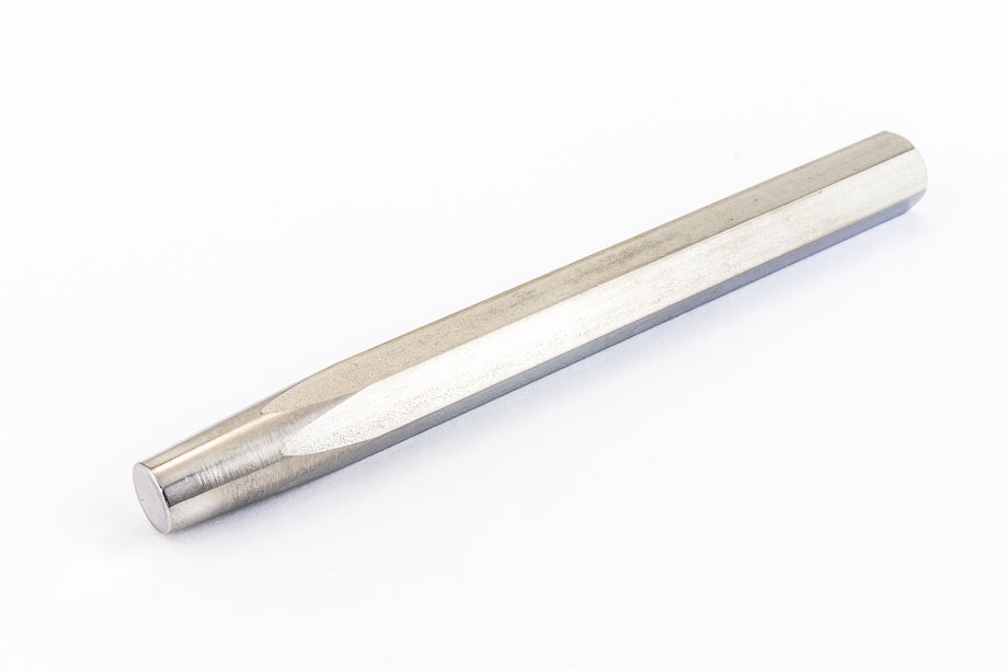 Stainless steel rivet setter, measures 90mm long with 8mm diameter at widest point.