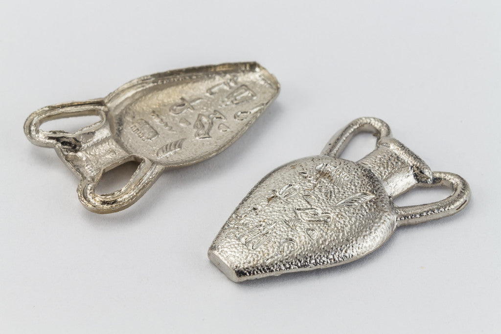 15mm silver tone two handled urn with hieroglyphs.