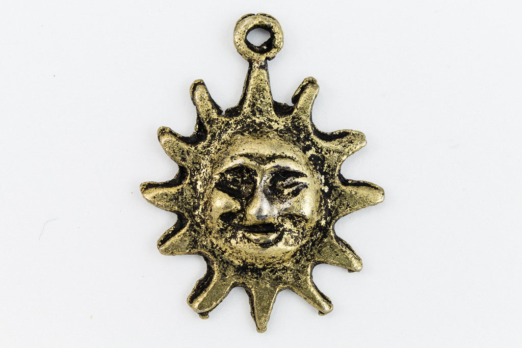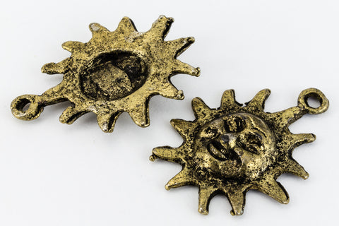 20mm x 25mm antique brass sun face with hollow back and loop at top.