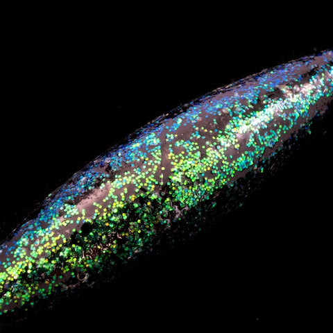 14mm x 52mm tapered cylinder shaped bead with shiny green glitter finish over black.