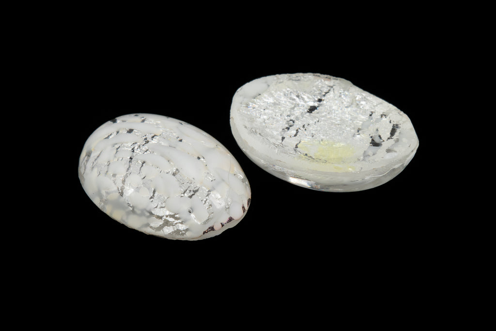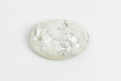 Clear with swirls of opaque white and flecks of silver foil.Made in Germany or the Czech Republic in the 1960's or earlier.Sold individually.