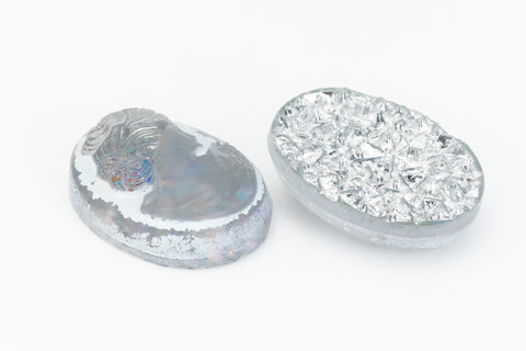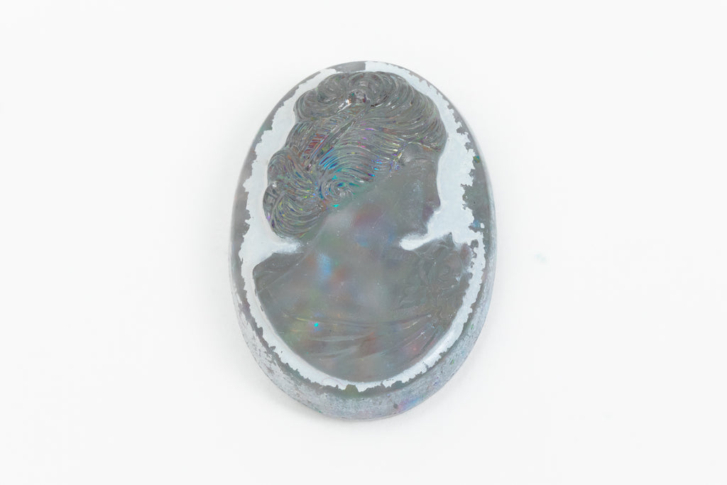 13.14mm x 18.07mm oval flat back with raised profile of a woman with coiffed hair.