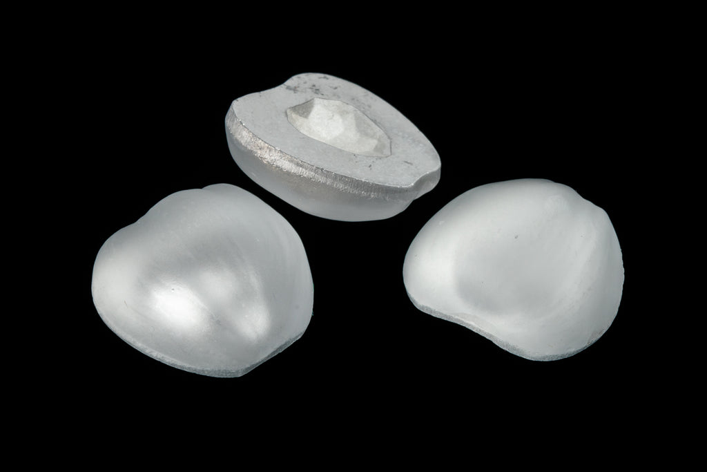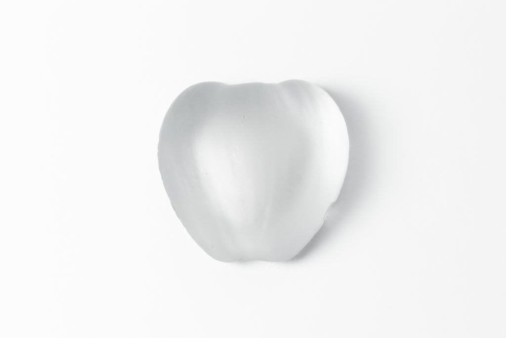 14.13mm x 14.23mm flat back shaped like an apple. Back is partially hollow.