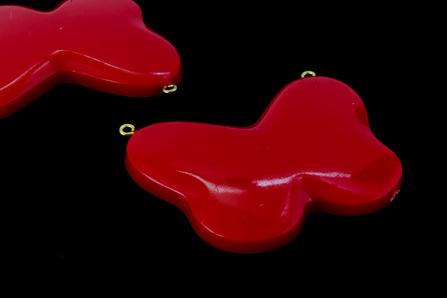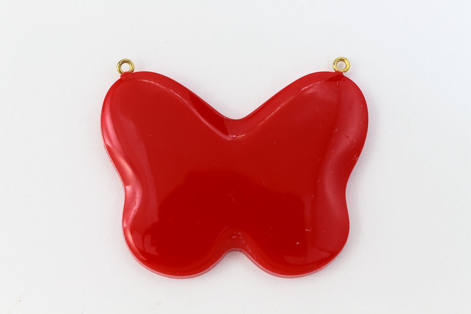 28mm x 38mm vintage Lucite opaque red butterfly shape with brass eye pins at tip of each wing.