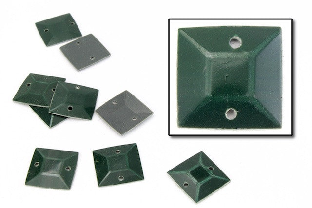 10mm domed evergreen square sequin with two holes. Grey on underside.