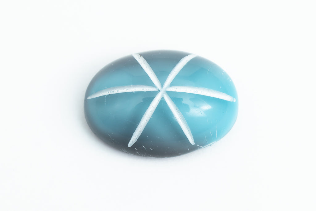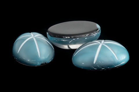 10mm x 14mm domed oval flat back.Steel blue with six rayed white starburst "asterism".